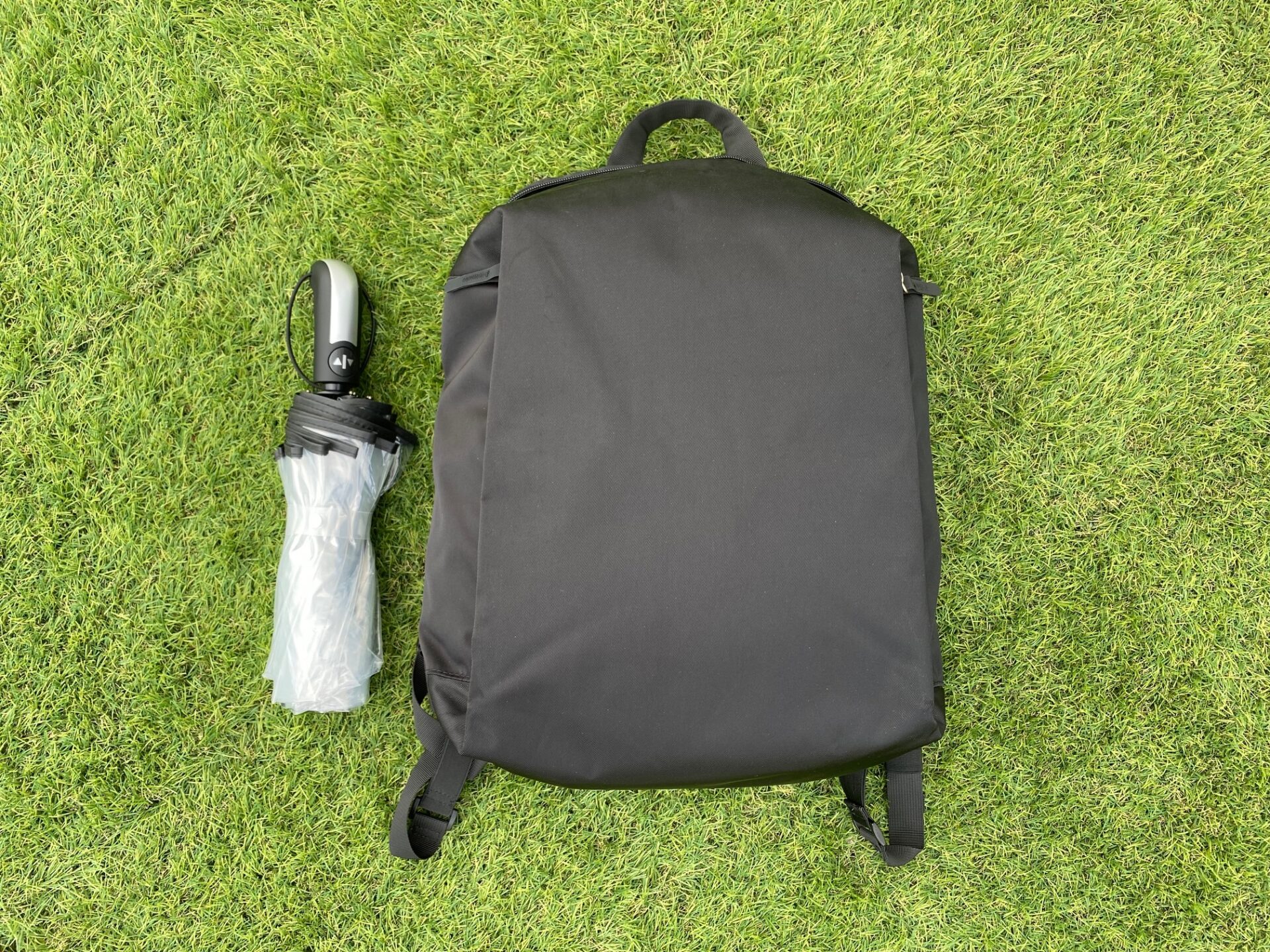 収納時のサイズは幅60ミリ、奥行き60ミリ、高さ340ミリで、通勤用のリュックにちょうど収まるサイズでした。