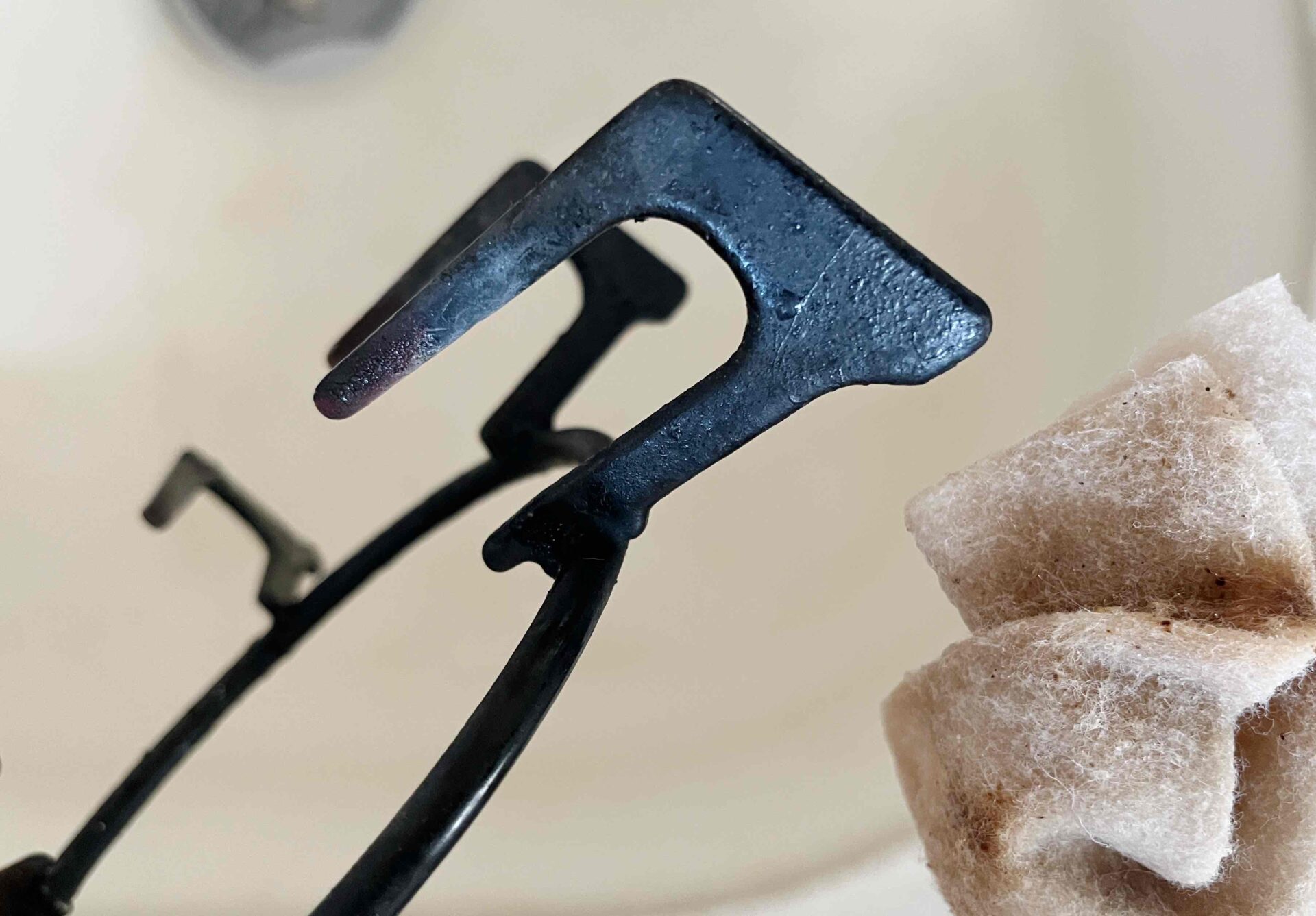 早速コンロの五徳を掃除してみました。油汚れがこびりついていて、細かい部分が多いのでとても掃除しづらいパーツです。